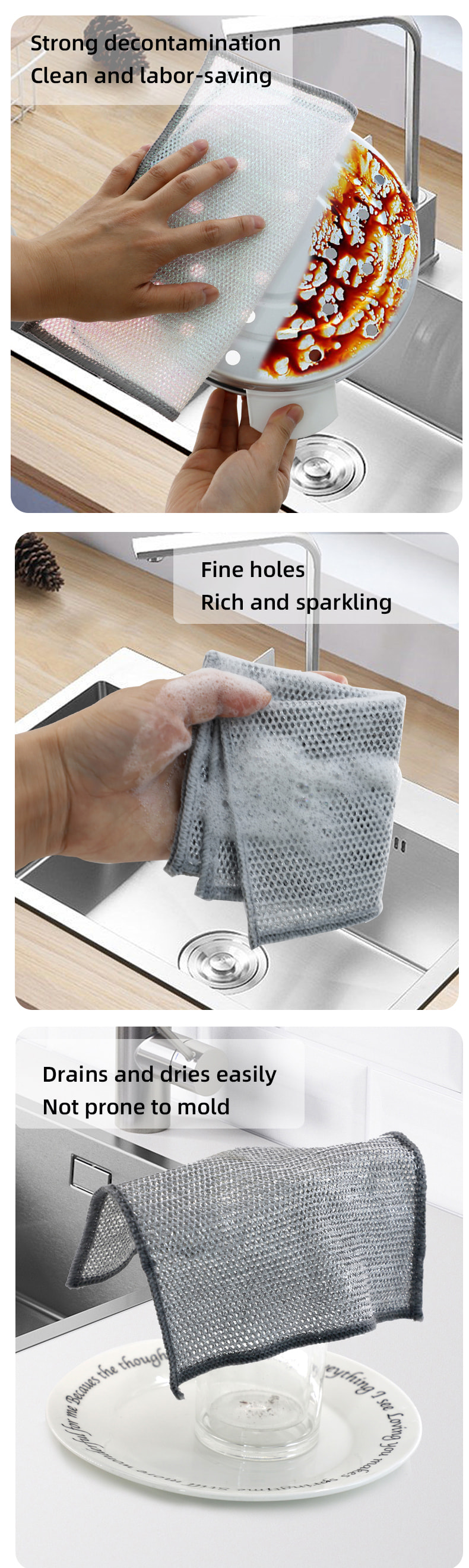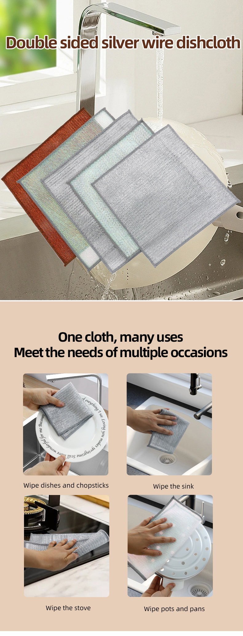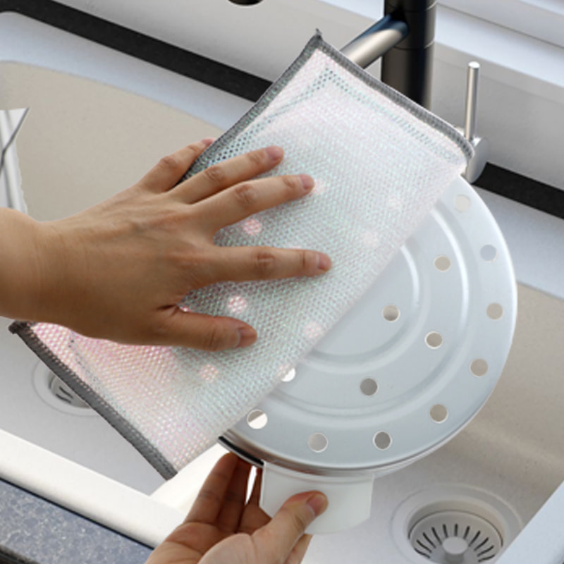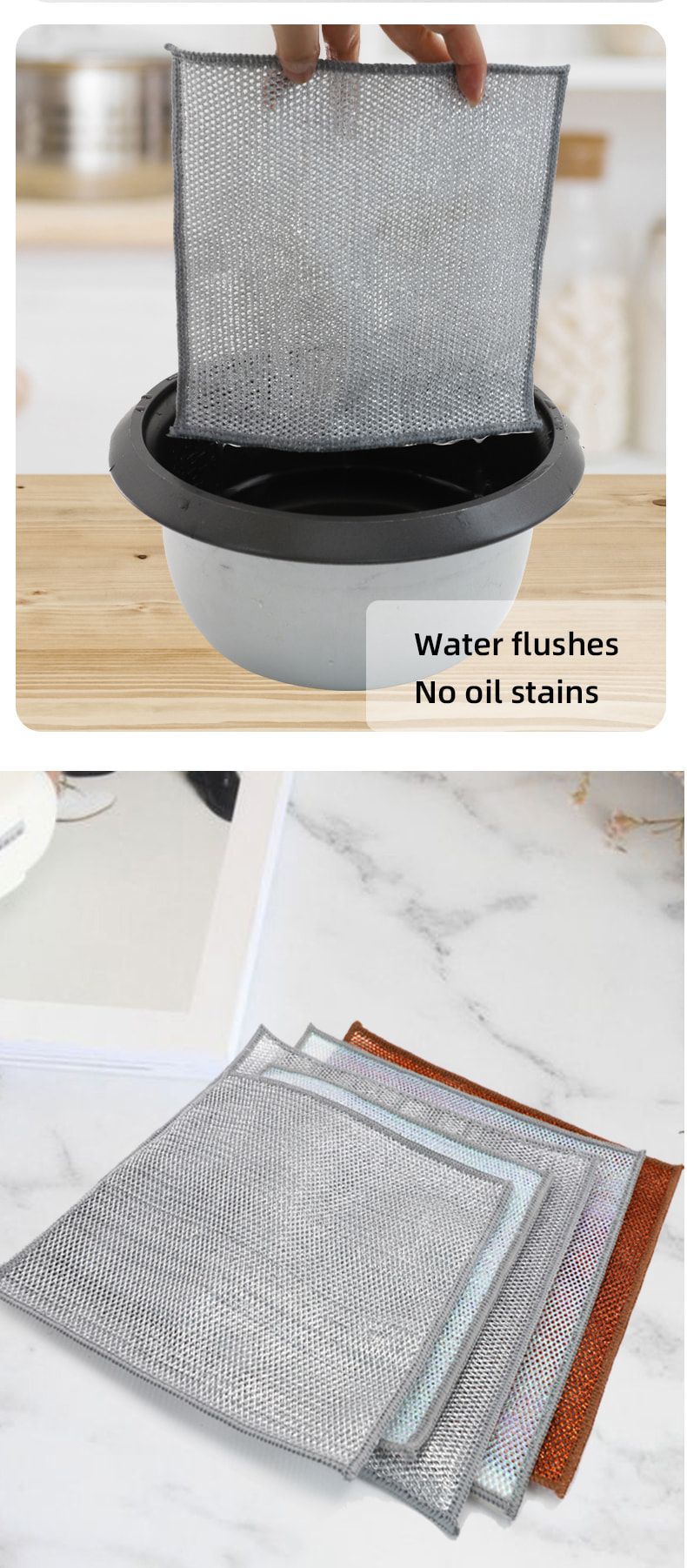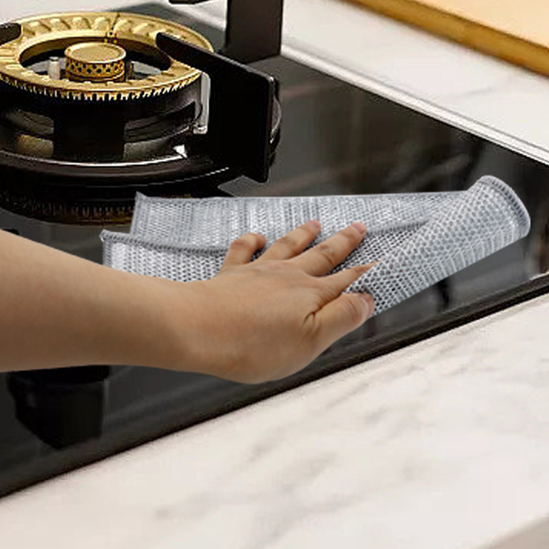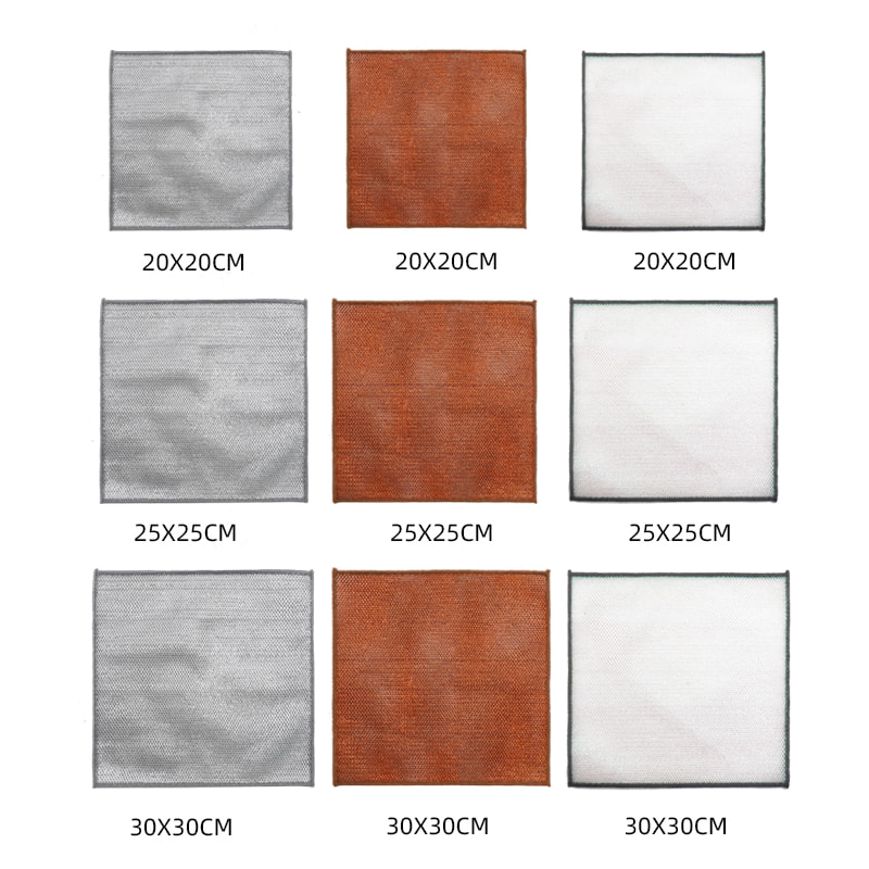 Pano de prato de fio de prata dupla face, feito de seda bronze, é muito caro; Sem revestimento, sem pó, sem desbotamento; Sem óleo, sem óleo, raspagem forte, mas sem danos à panela. Feito de seda colorida, é oleoso e não pegajoso, com alto valor de aparência; Sem revestimento, sem queda de pó, sem desbotamento da cor; Raspagem forte, mas sem danos à panela.