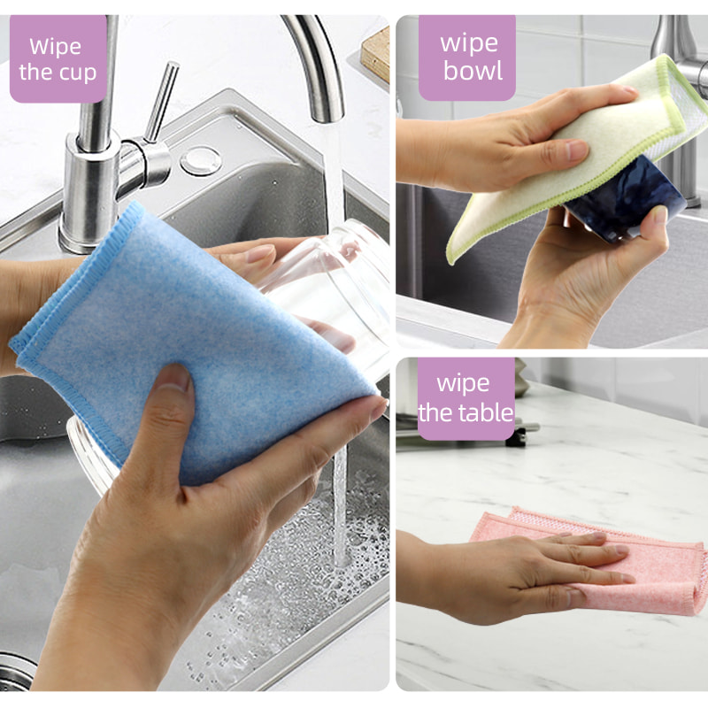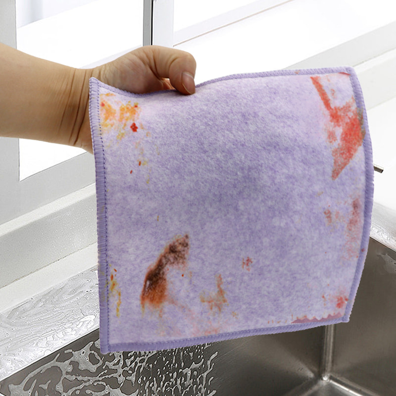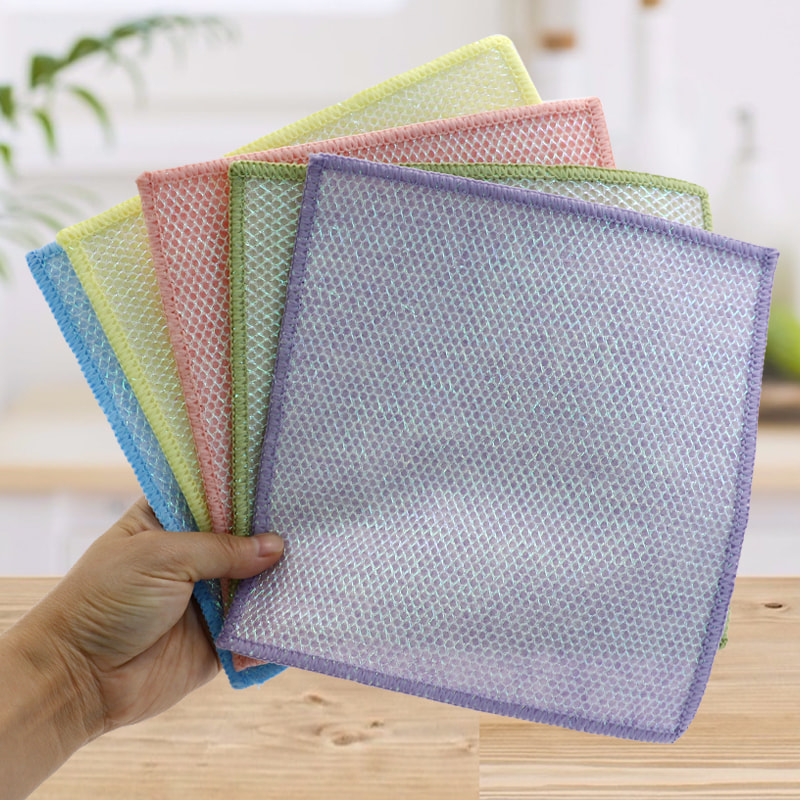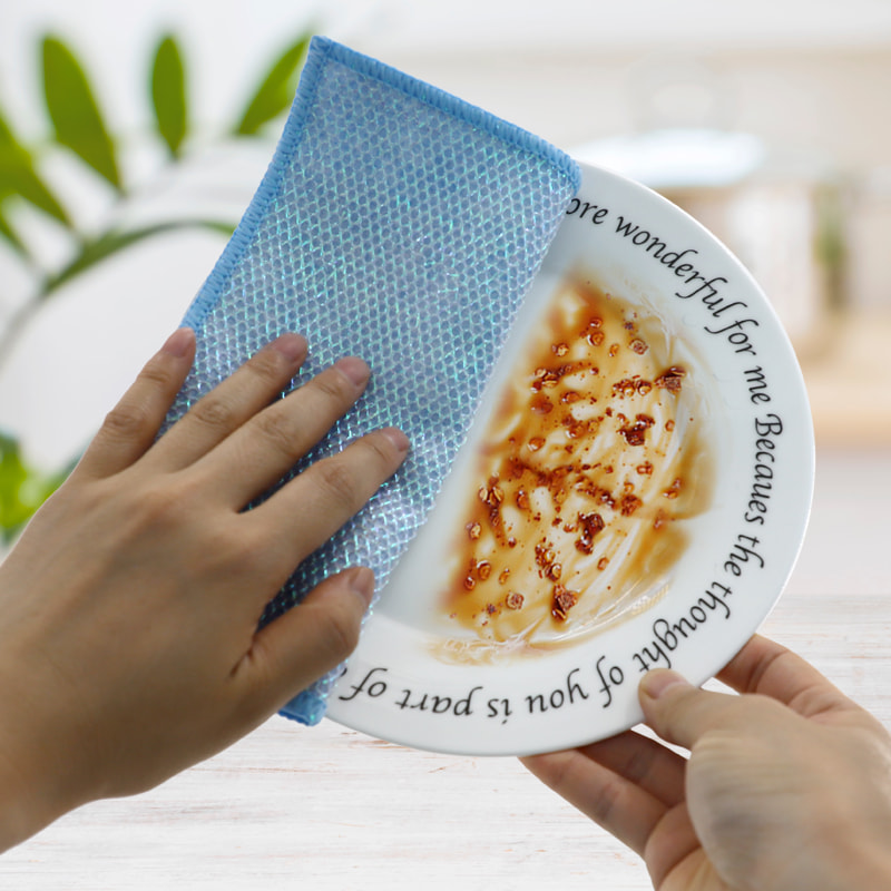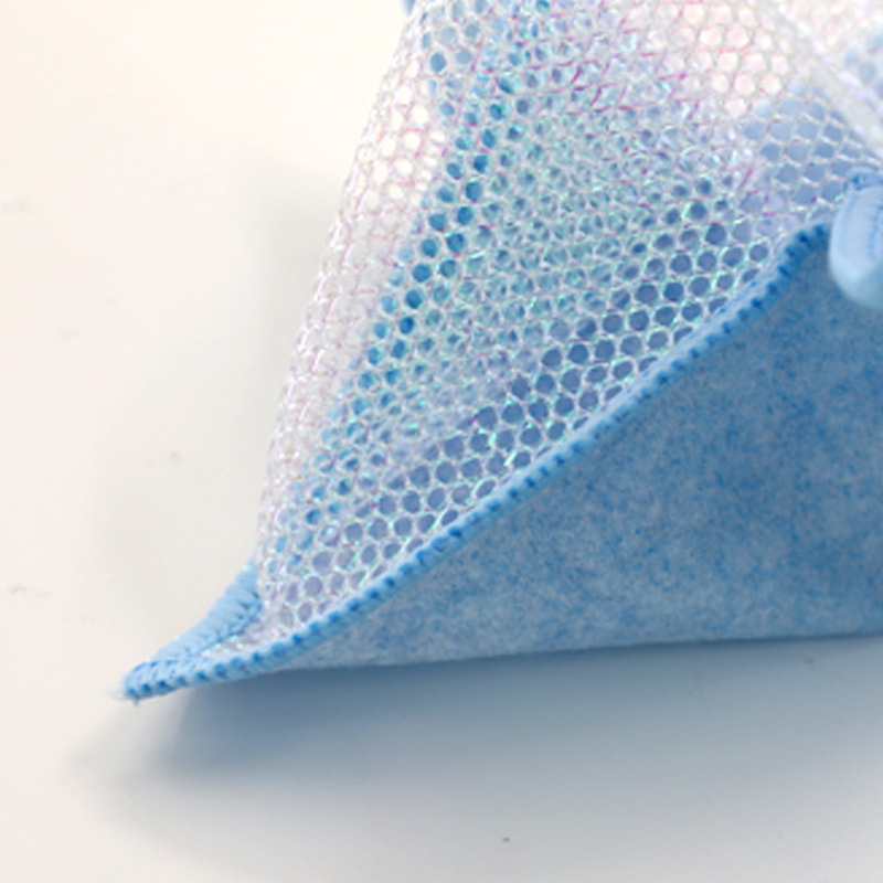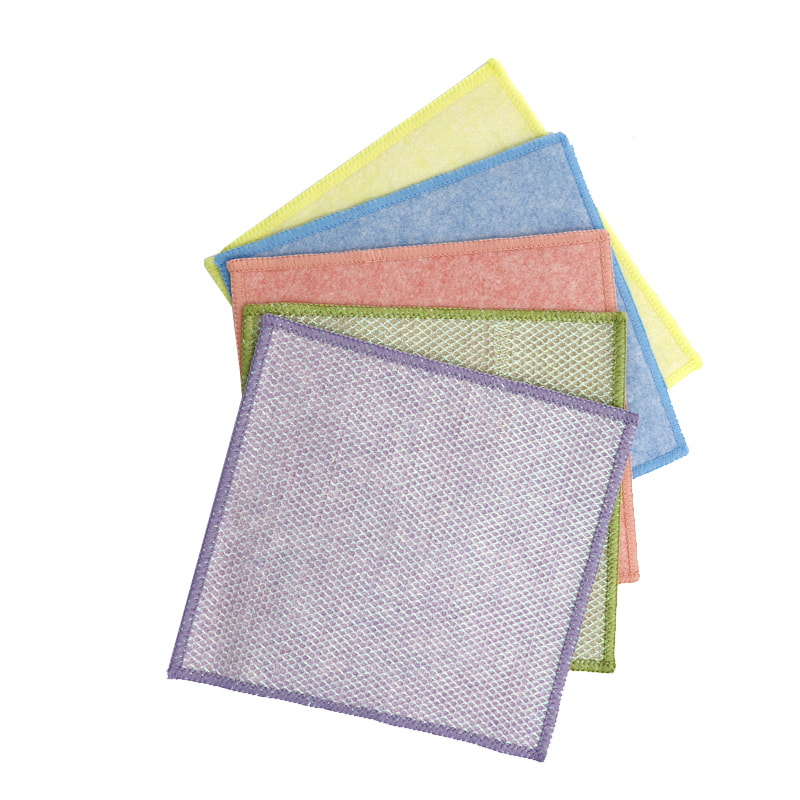 Estrutura em formato especial, colorida e de alta aparência; Um lado é um pano de limpeza colorido com forte capacidade de raspagem, e o outro lado é um pano de malha, que atende às duplas funções de limpeza durante a raspagem; É isento de óleo e tem forte absorção de água. Um lado é implantado com seda colorida de vários padrões, e o outro lado é uma superfície de tecido de viscose não oleosa e absorvente de água, que é bonita e pode atender às funções duplas de esfregar e esfregar de um lado.