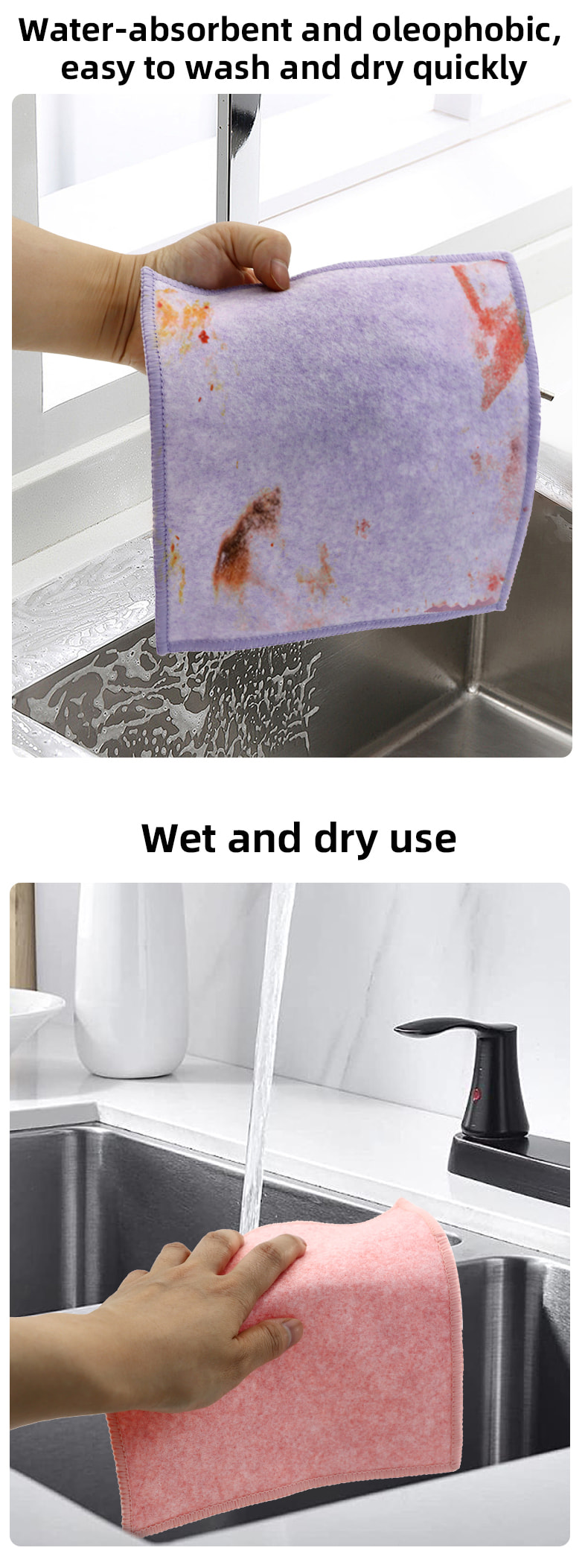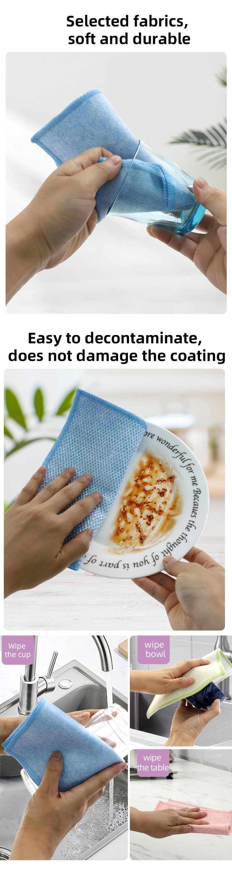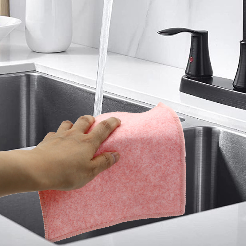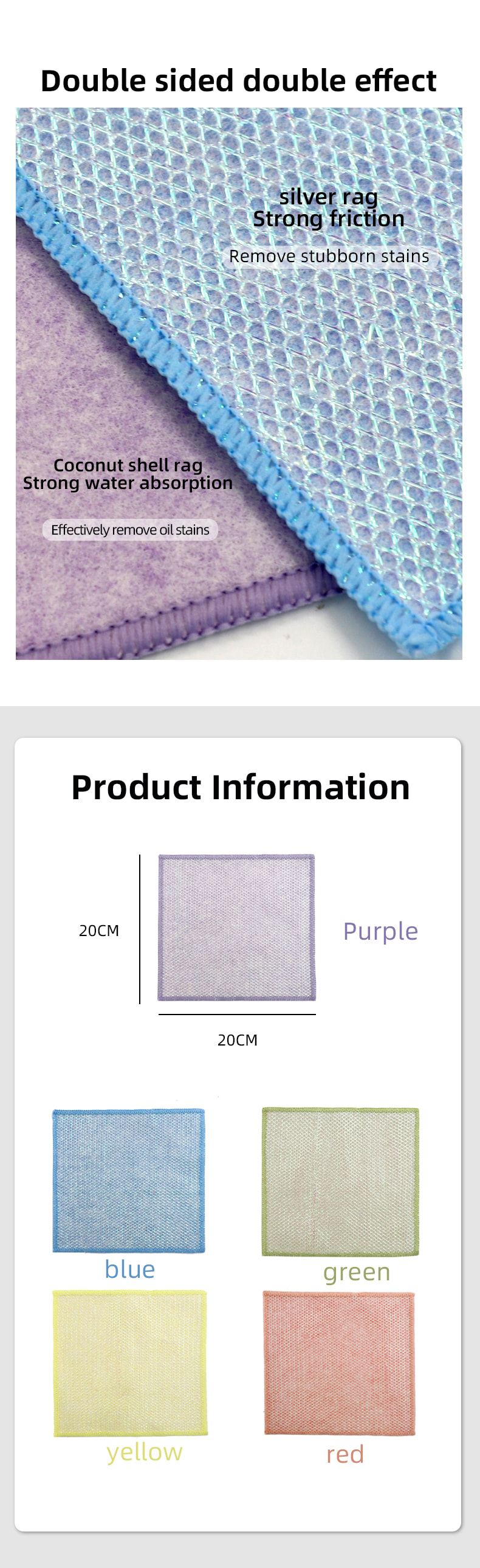Estrutura em formato especial, colorida e de alta aparência; Um lado é um pano de limpeza colorido com forte capacidade de raspagem, e o outro lado é um pano de malha, que atende às duplas funções de limpeza durante a raspagem; É isento de óleo e tem forte absorção de água. Um lado é implantado com seda colorida de vários padrões, e o outro lado é uma superfície de tecido de viscose não oleosa e absorvente de água, que é bonita e pode atender às funções duplas de esfregar e esfregar de um lado.